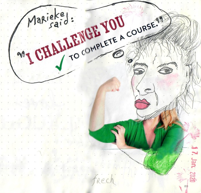 Ich fand diesen neuen “Kurs” namens “Course Completion Challenge” (Herausforderung einen Kurs zu beenden), durch den die verrückte, quirlige Marieke Blokland führt. Es geht darum bis Ende Dezember 2019 einen bisher unvollendeten Kurs abgeschlossen zu haben. Ja, die Deadline ist nun eine Weile vergangen. Aber ich war und bin noch ziemlich sicher, dass dies genau der Plan ist, dem ich in der nächsten Zeit folgen werde. Wie auch immer. So lange es geht…