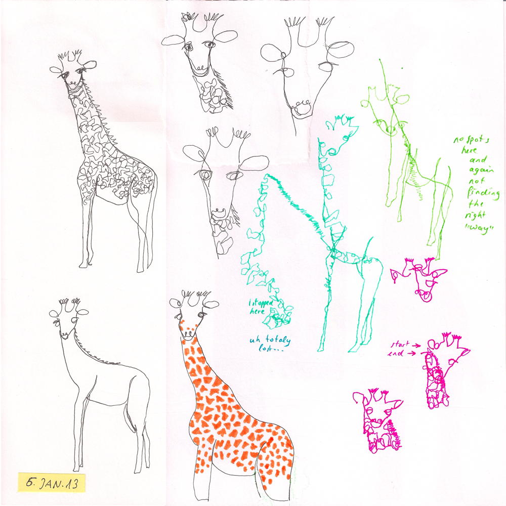my first giraffe – weekend I’d better should not start my creative time with exercises like blind contour drawing. The outcoming is so much frustrating. I start at one point and does’nt find the way back – not blind. No no. Share this: Click to share on Facebook (Opens in new window) Facebook More Click to print (Opens in new window) Print Like Loading... Related