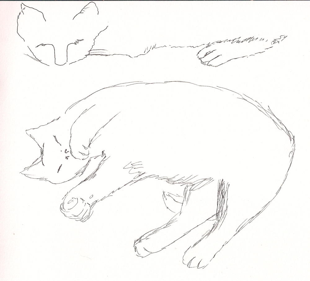 Almost every evening while I’m sitting on my sofa and trying to read my book cat ‘Amber’ snooze and loll right in front of me. Although it moves very slow it is difficult to draw because it stay in its position only a few every moments. This is one drawing where ‘Amber’ started lolling and ended in the snooze position – on the edge of my paper…