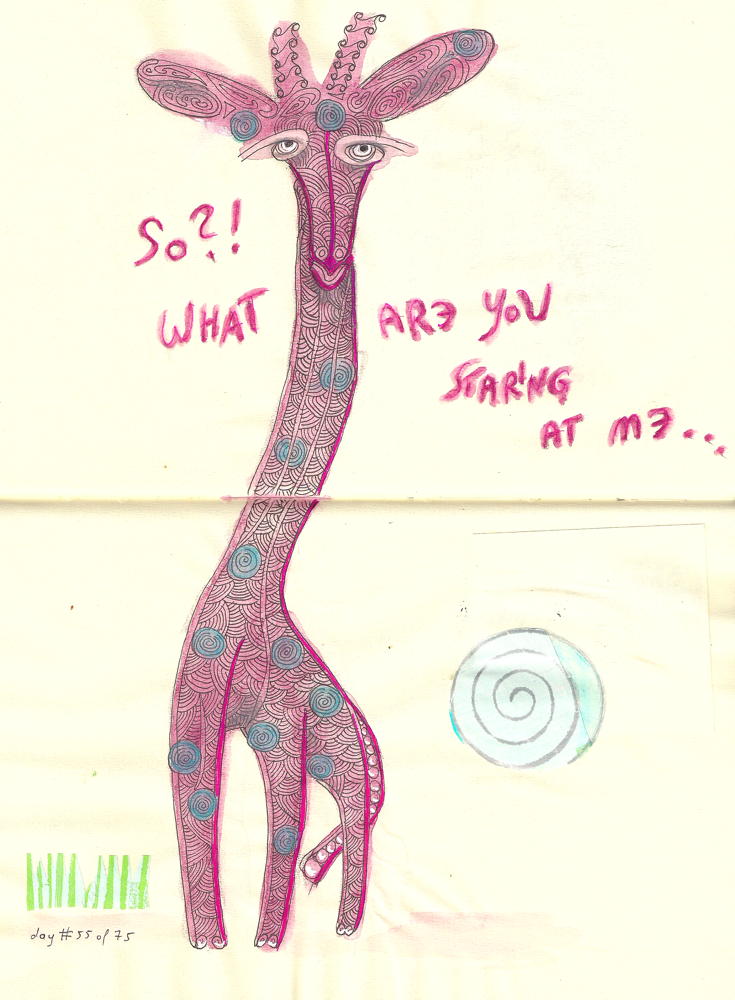 So?! What day#55 of 75giraffe feb#10so?! what After taking my medicine on friday night I mostly have fog in my brain on saturday. side effects. I only can wait and doodle… journal page with pen/ink and pencil/water-color wash and colored marker Share this: Click to share on Facebook (Opens in new window) Facebook More Click to print (Opens in new window) Print Like Loading... Related