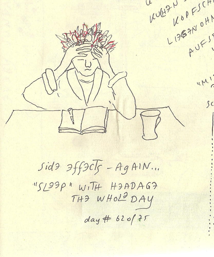 Side Effects day#62 of 75side effects journal page with pen/ink Share this: Click to share on Facebook (Opens in new window) Facebook More Click to print (Opens in new window) Print Like Loading... Related