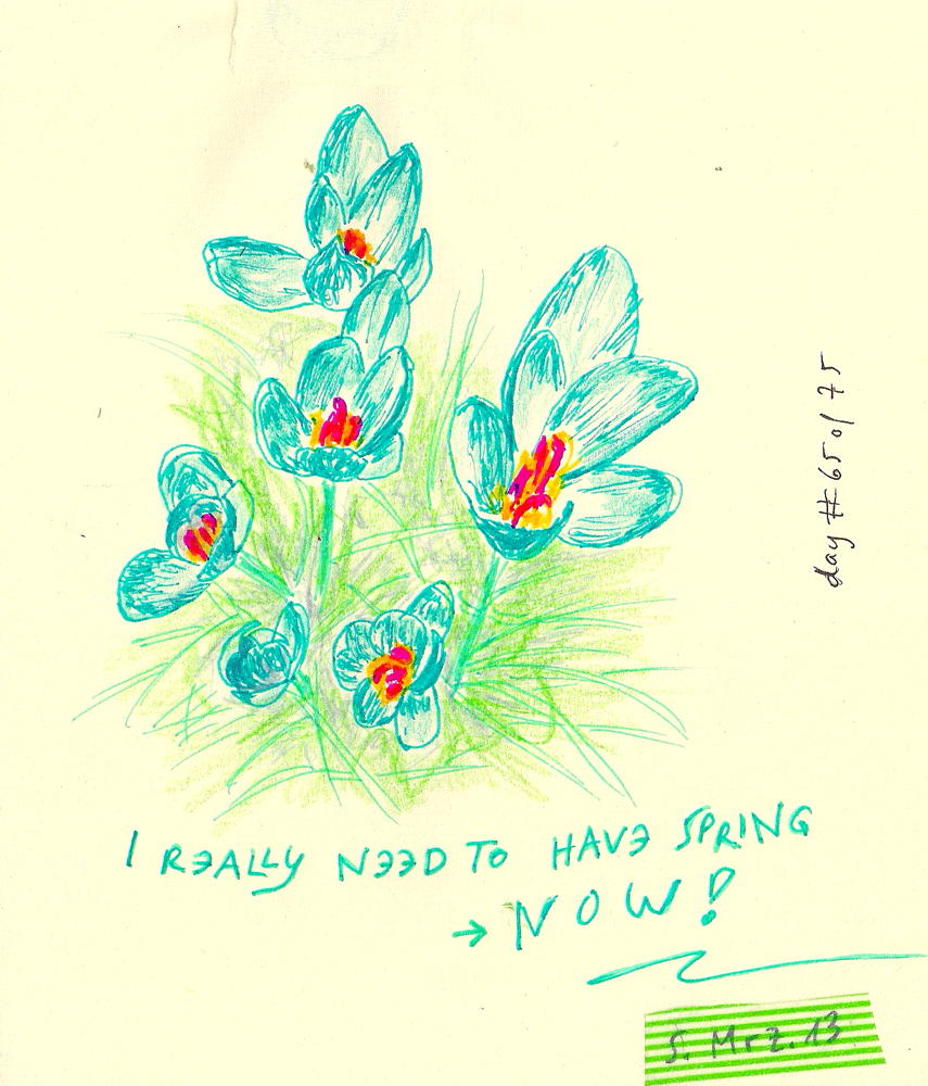 Spring Needed day#65 of 75spring needed It comes and goes and comes…. I need to have warm and sunny spring – now!! journal page with colored markers Share this: Click to share on Facebook (Opens in new window) Facebook More Click to print (Opens in new window) Print Like Loading... Related