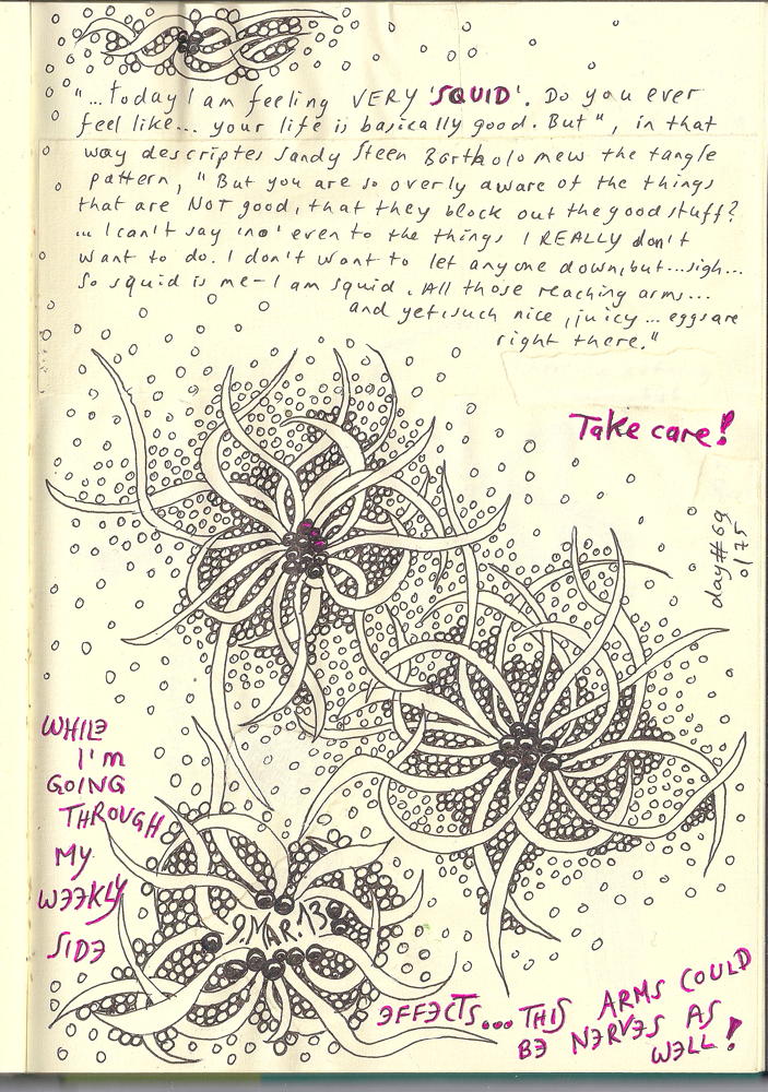Feel Squid day#69 of 75my nerves while I’m going through my weekly side effects and drawing and doodling this pattern… i think this could be nerves. journal page with pen/ink Share this: Click to share on Facebook (Opens in new window) Facebook More Click to print (Opens in new window) Print Like Loading... Related