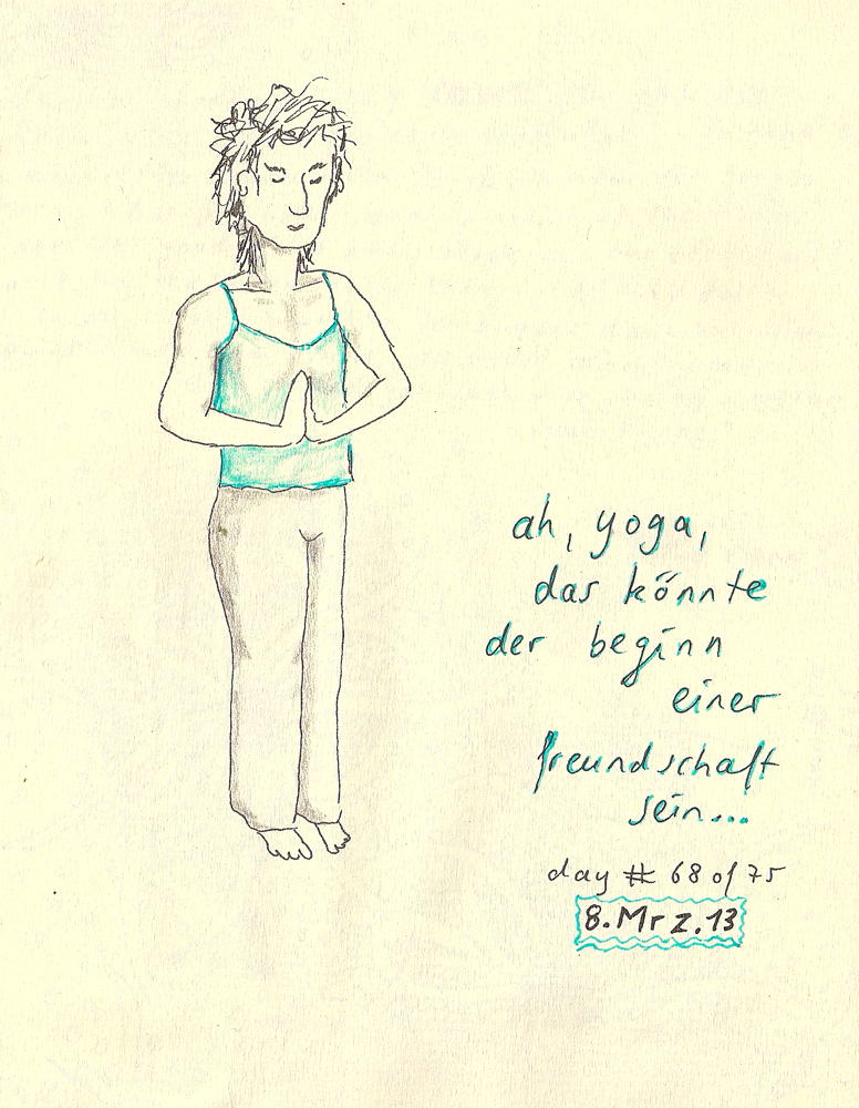 Yoga day#68 of 75yoga today I did my first yoga ‘greeting the sun’… this could be the beginning of a long friendship… – so sorry that I couldn’t draw every movement 😉 journal page with pen/ink and pencil/water-color Share this: Click to share on Facebook (Opens in new window) Facebook More Click to print (Opens in new window) Print Like Loading... Related