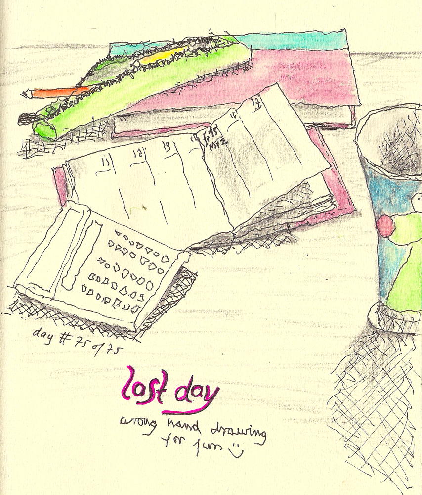 It is the last day of my journey through the 75 sketches in 75 days challenge, but I will continue to draw only ink sketches and other drawings once a day…. with the wrong hand or the right hand. It was fun.