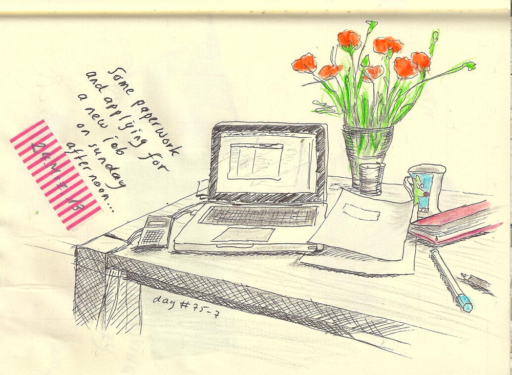 Paperwork day#75-7paperwork Time to apply for a new job and to do the necessary paperwork. journal page with pen/ink and pencil/water-color wash Share this: Click to share on Facebook (Opens in new window) Facebook More Click to print (Opens in new window) Print Like Loading... Related
