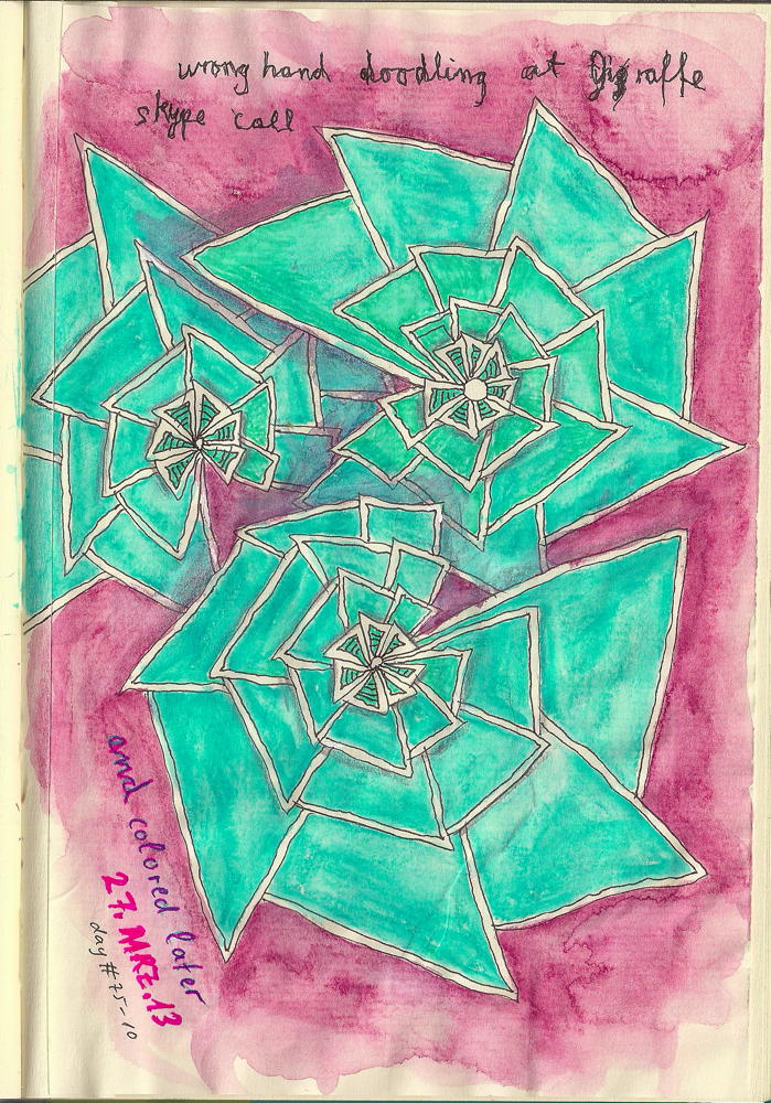 I’m interested in doodling and followed some advises to learn more about tangle pattern. Today while the Skype conversation with the fellows of the “Year of the Giraffe” I do my pattern (with my wrong hand) …. and colored the page later.