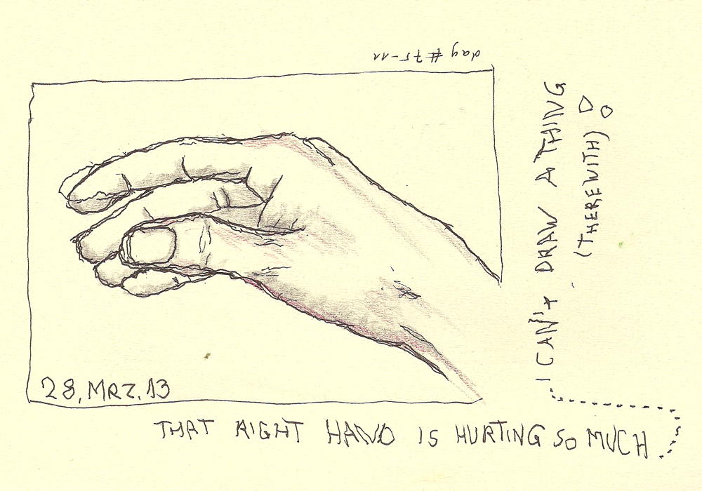 My right hand hurts so much. I’m very unpleased because I like to draw and paint and sew and handcrafts a lot these days. It is a little difficult to do this all with my wrong hand. And – luckily – this slow me down.