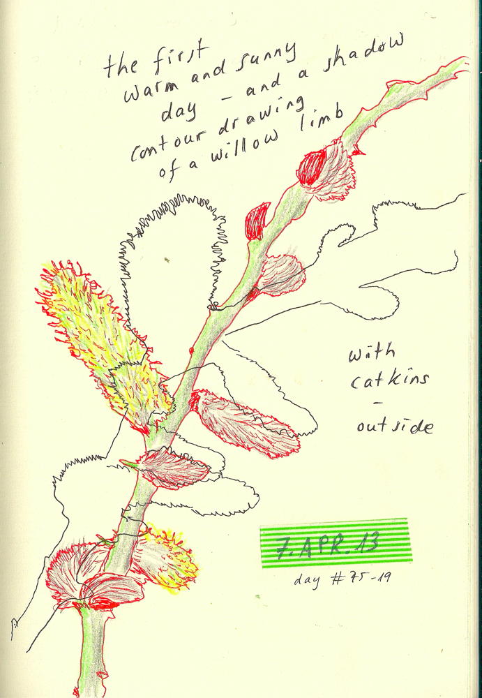 Willow Catkins day#75-19willow catkins The sun was warm and strong – strong enough to show clear sharp shadows… – warm enough to draw for a while outside… journal page with pen/ink in black and red and pencil/water-color Share this: Click to share on Facebook (Opens in new window) Facebook More Click to print (Opens in new window) Print Like Loading... Related