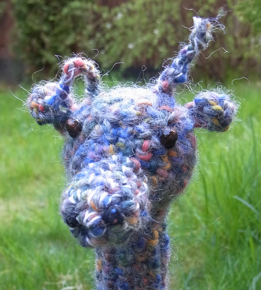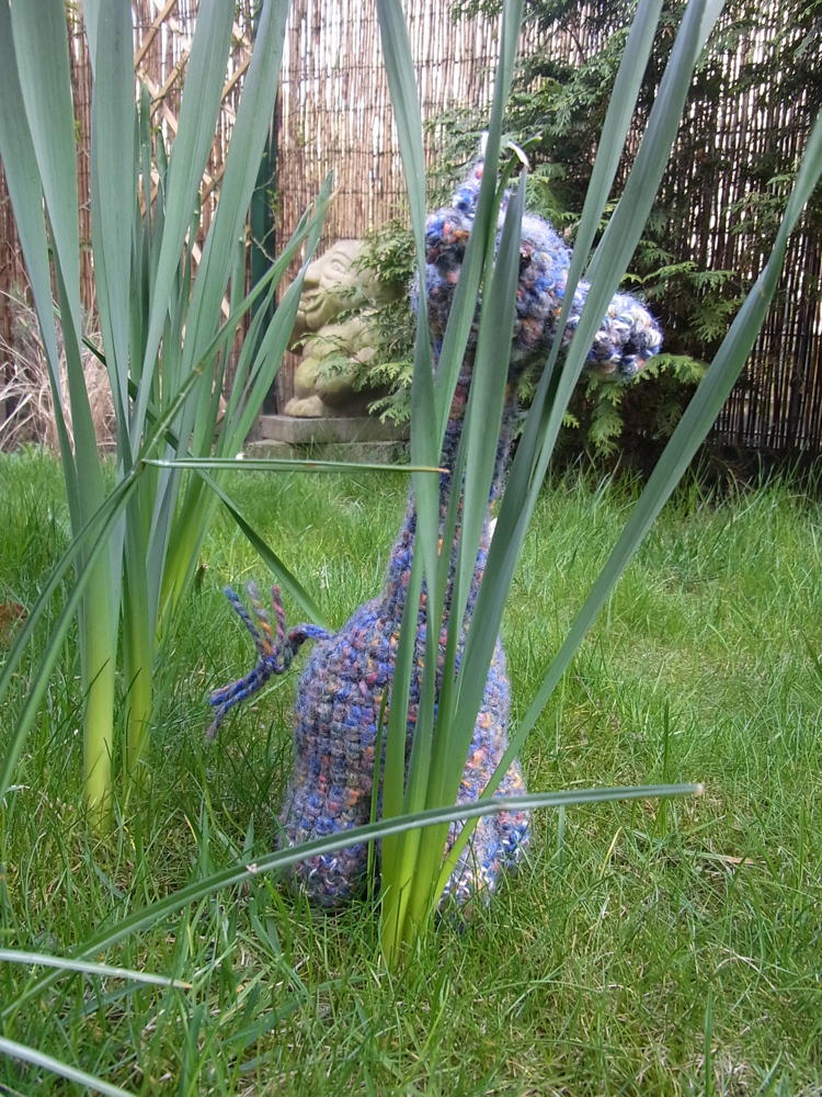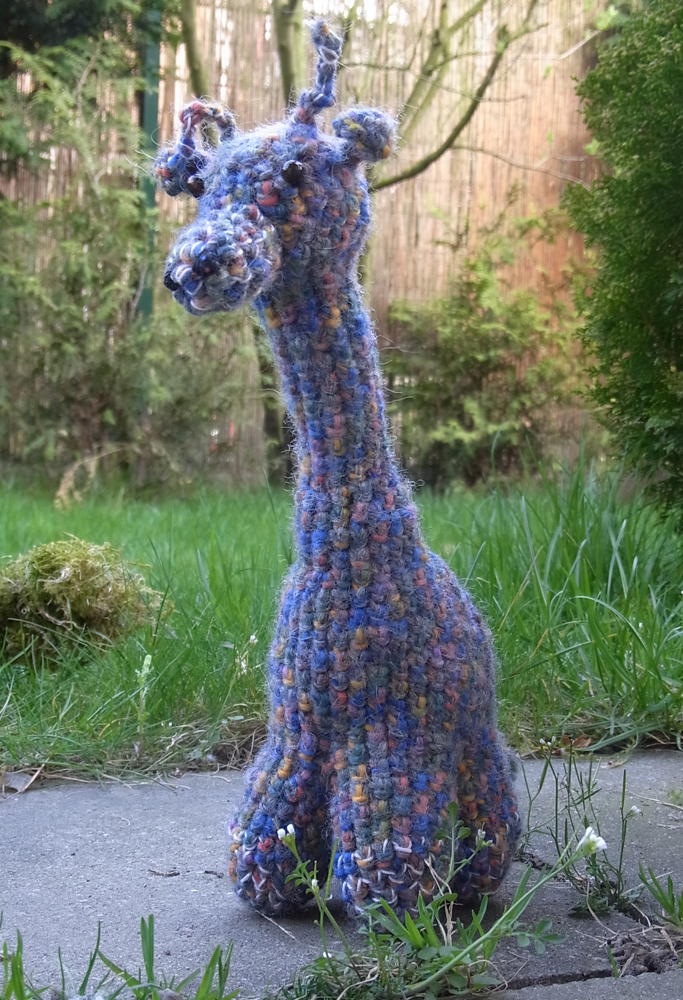 Among the hints and links for stuffed giraffes was this one to the crocheted giraffe ( almost-one-piece-giraffe-pattern ). I did lots of crocheted cloths for my little dolls when I was very young. So I wanted to crochet this giraffe when I saw this. Now it’s done. At first I was not happy with it – untill I added the horns and ears on that little head. And now I’m exited!!