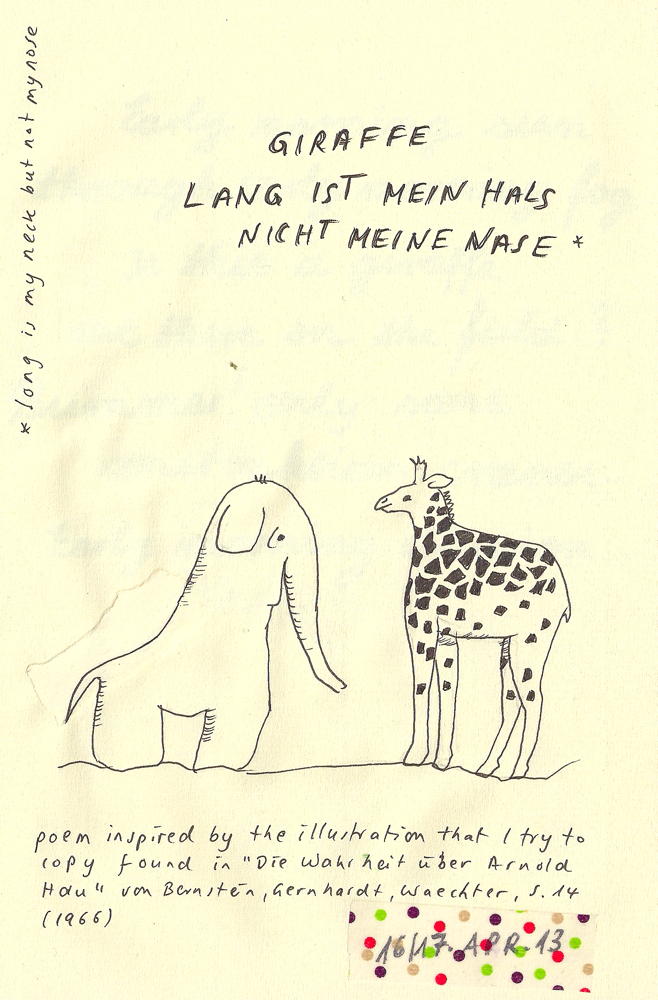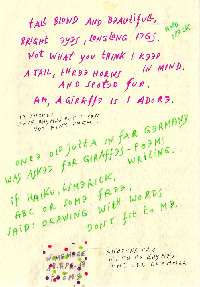 Poems The assignment for this week was to write poems with the topic ‘giraffe’. I tried hard and here are some (the only) solutions. Share this: Click to share on Facebook (Opens in new window) Facebook More Click to print (Opens in new window) Print Like Loading... Related