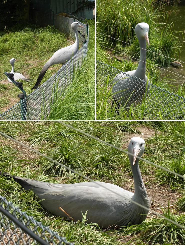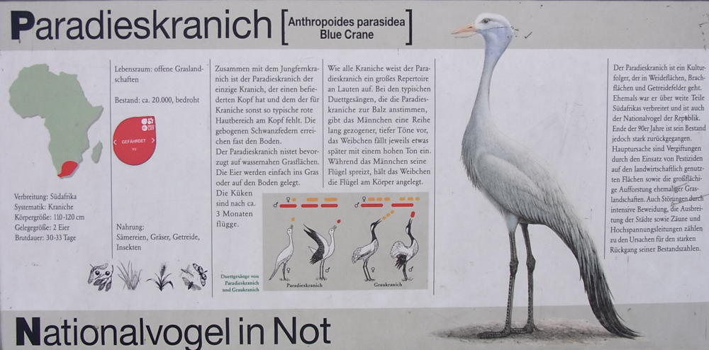 This Crane in german is named paradies crane. In English it is named blue crane. But it is grey. I met a couple of this crane. She is breeding on the open grass near the little lake. He is kind of patrol along the fence.