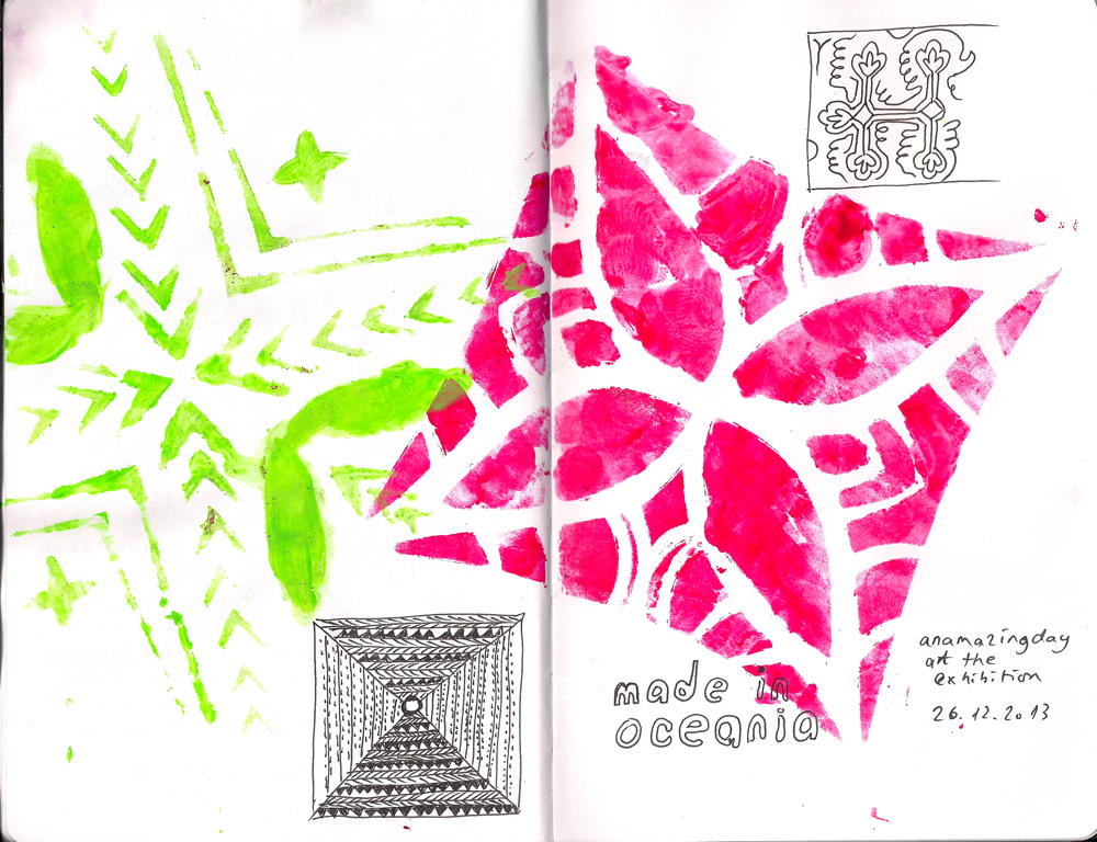 I had an amazing day at the exhibition “Made in Oceania: Tapa – Art and Social Landscapes” in Rautenstrauch-Jost-Museum in Cologne with my friend. I only could make a few sketches – though I have to return there some days later. And I bought my first stencils, but – as you see – with this I have to become more familiar.