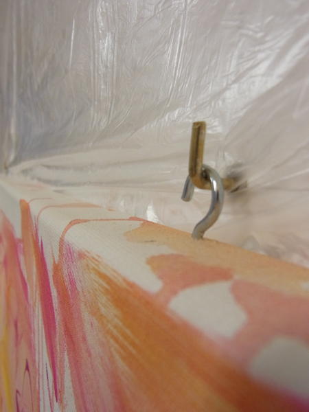 I worked all day to get the lightening on the ceiling of my room of creativity. Exactly: my old farther worked mainly on this target. And at the end he added two hook on the wall to hang my canvas in. My father is full of practically ideas. As you can see he not only put a hook in the wall but as well in the canvas. I love this style. (I hope to work on my 2. layer tomorrow when my flu and head age are gone – hopefully.)
