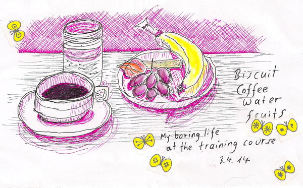 Another day only staring in my cup of coffee, eating biscuits and some fruits, and listening to the endless monologue of the tutor. Why not exercise a table top drawing and keeping my pen moving…