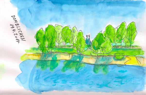 The view from one side to the other side of river Rhein and Cologne Cathedral. I went a bit over board with my drawing and the coloring. And I lost my concentration and my focus during my work. Because it is only a really really really tiny spot. Hardly remarkable. Only a sculpture marks where you have to look and where you can see the cathedral. More about it you’ll find here.