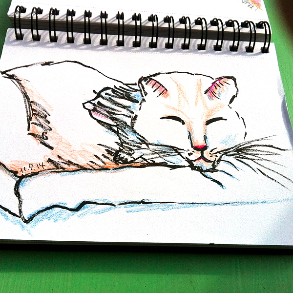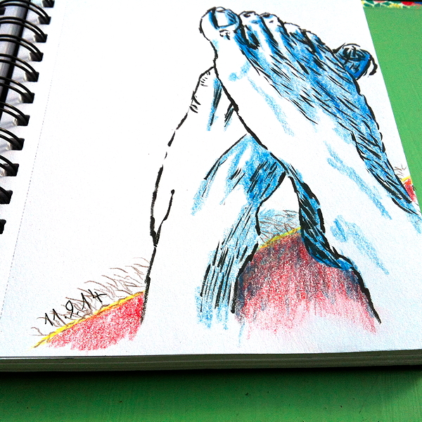 The cat was too fast. But not my feet. As soon as I sat down on the floor the cat stand up and changed its place. So I draw what I saw just in front of me. I’m still playing around with pentel ink brush pen and prismacolor colored pencils…. At last I got an impression of tired car, Amber. Share this: Click to share on Facebook (Opens in new window) Facebook More Click to print (Opens in new window) Print Like Loading... Related