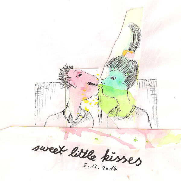 Inspired by the picture of a kiss in my advents calendar: imaginary creature based on odd pieces of paper with water-color blobs