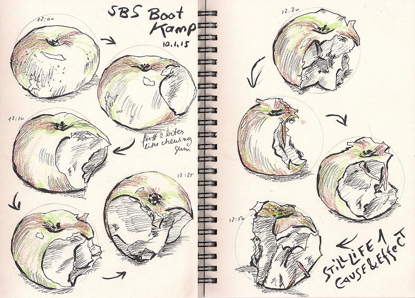 For one year now I am at school, exact Sketchbook Skool. After three semester I got a freebie and now I am running with Sketchbook Boot Kamp. The first assignment is to slow down and draw the apple while I am eating it bite and bite…