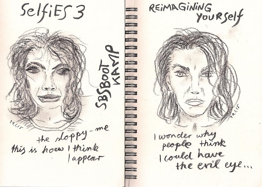 Sketchbook Skool Boot Kamp, under the topic “selfies” again I was reimagining myself. But with a lack of imagination…. I’ve chosen a charcoal pencil and realised when I was drawing from memory that this was the best choice for my sloppy appearance. The portrait on the right I draw from the mirror, well, I wanted to emphasize my very angular hairline. In combination with my light eyes and the strong eyebrows I got a sort of scary portrait – the other me ….