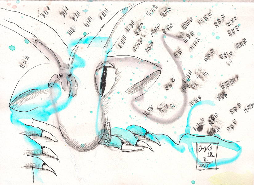 Sometimes I’m looking helpless on my scribbles or blobs asking what will appear today… So today I managed to go with the flow of the drawing: a little critter with horns, a big eye, two ears (I was not completely convinced) and two horns, a right claw and a line to the right, a left claw… and very shy a story peeks around the corner… a line thinking of a news paper, oops an ink-accident which I turned into stamping. Well, then I started too much pondering about the next line and ruined the flow and the drawing with a pointed snout. Step back step back step back. I had to cover the line with white gel pencil. The story goes on and the creature is biting into the news paper thing. Some pattern over the stampings. Some light shading. Yes, I did something complete different 😉