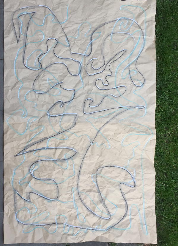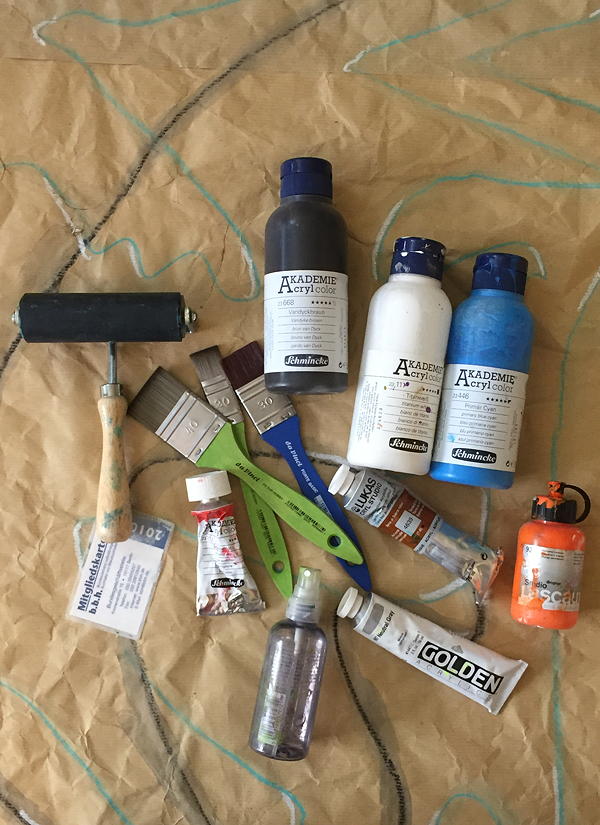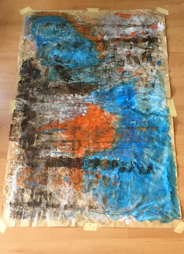 Behind the scene – well – I’m struggling with getting some art work done. And I’m trying to figure out what is holding my back, Today I followed that urgent feeling to put some paint down. On that odd prepared paper that was starring at me for weeks dangling on my front door. It is 100 x 150 cm (appr. 39 x 59 ”) large. A nice size. Due to a lack of space I had to work on the floor. That’s pretty nice too. But afterwards I noticed that it bugs me to prepare that arrangement on the floor, it bugs me to work carefully or to destroy the paper (and paint on my floor)… you get the point.