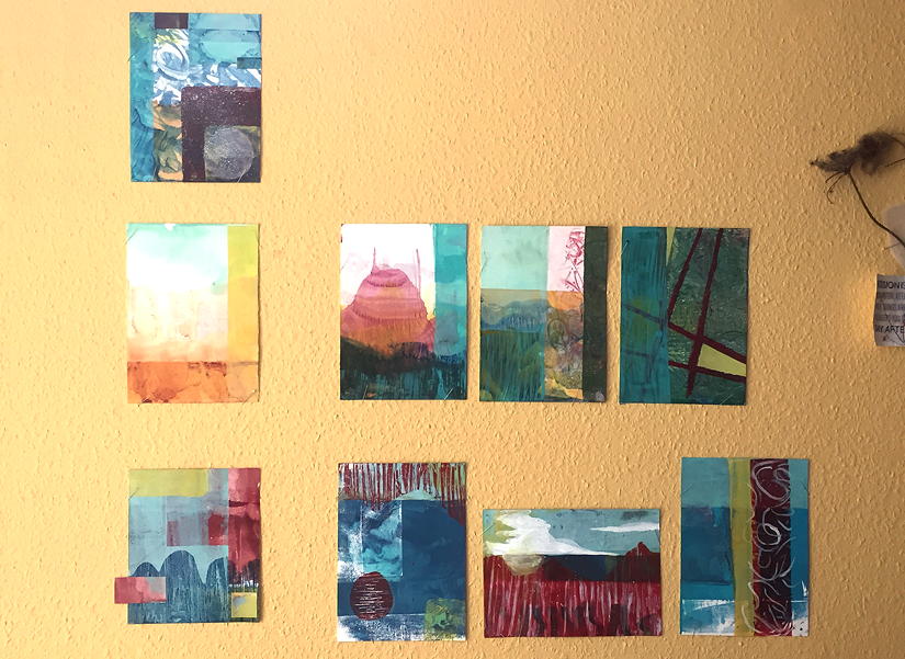 I followed the process and some rules that Carla is showing in her class like “always mixing two colors” and I choose one color palette for the complete bunch of prints. Well in the first try I’ve printed 8 sheets as suggested, and another 8 in the second try with slightly adjusted colors, and then I was sticking to them with the goal of finishing all 16 prints. (BTW: you find the pictures numbered… if you wonder.)