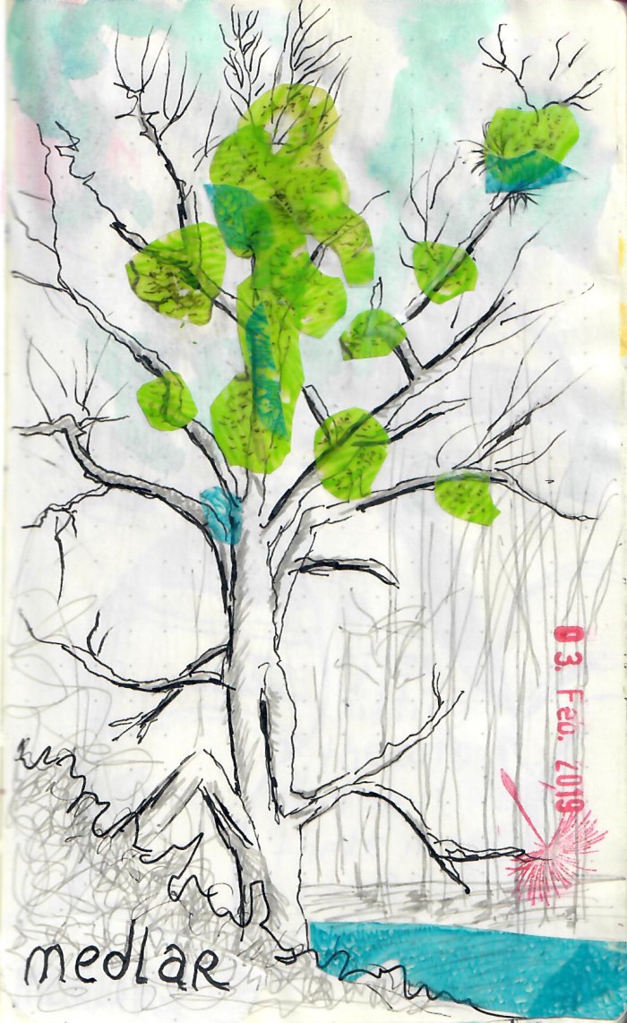 I decided to combine my topic of the year ‘collage’ with the daily drawing at sketchbook challenge. On my way the sunny afternoon I met this empty willow tree where the medlar live. A great opportunity to use transparency folie over the bw-drawing.